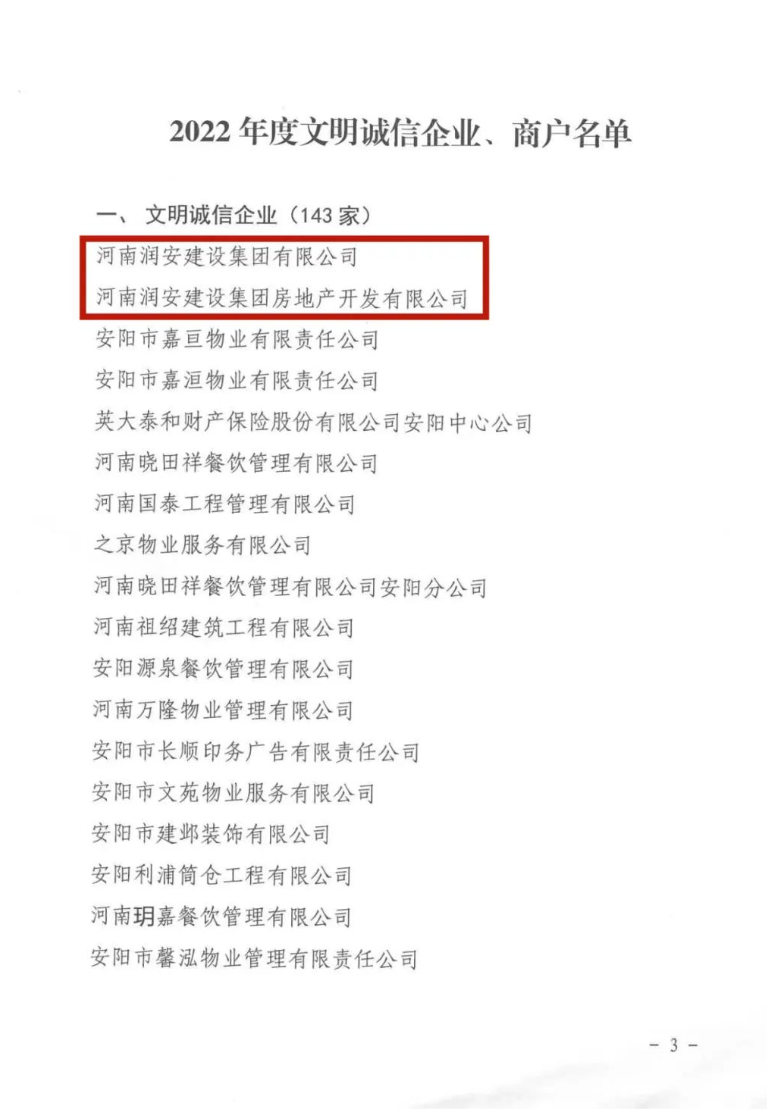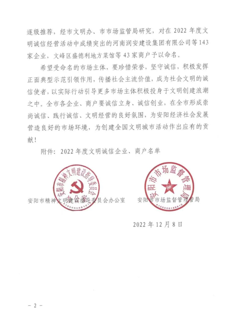 近日,安陽市精神文明建設(shè)指導(dǎo)委員會(huì)辦公室、安陽市市場(chǎng)監(jiān)督管理局聯(lián)合印發(fā)《關(guān)于命名2022年度安陽市“文明誠信企業(yè)、文明誠信商戶”的決定》。河南潤安建設(shè)集團(tuán)有限公司、河南潤安建設(shè)集團(tuán)房地產(chǎn)開發(fā)公司雙雙榮登“安陽市2022年度文明誠信企業(yè)”榜單,分別名列榜單第1名和第2名。